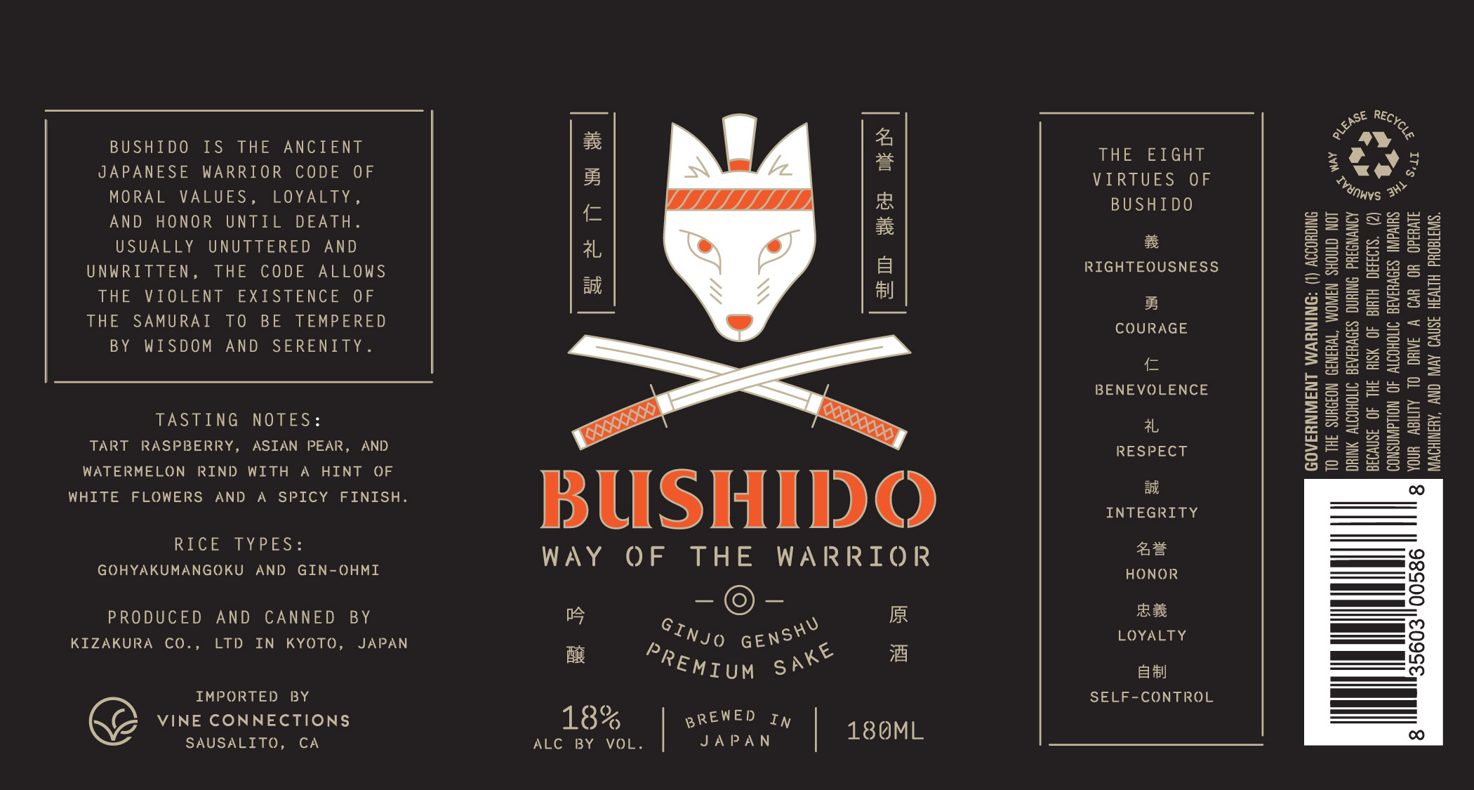 On-the-go, hassle free, premium Ginjo Genshu sake in a can. Bushido is the ancient Japanese warrior code of moral values, loyalty, and honor until death. Usually unuttered and unwritten, the code allows the violent existence of the samurai to be tempered by wisdom and serenity.